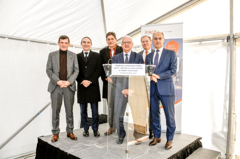 Le 17 décembre dernier, Benoist Apparu, président du directoire d'In'li, Thierry Staron, directeur de la SEMRO, Claude Papillon, maire de Rosny-sous-Bois et 1er Vice-président de Grand Paris Grand Est, ainsi que Loïc Madeline, directeur général délégué de Linkcity Ile-de-France ont posé la première pierre du Lot 8 de la Zac de la Mare Huguet à Rosny-sous-Bois.